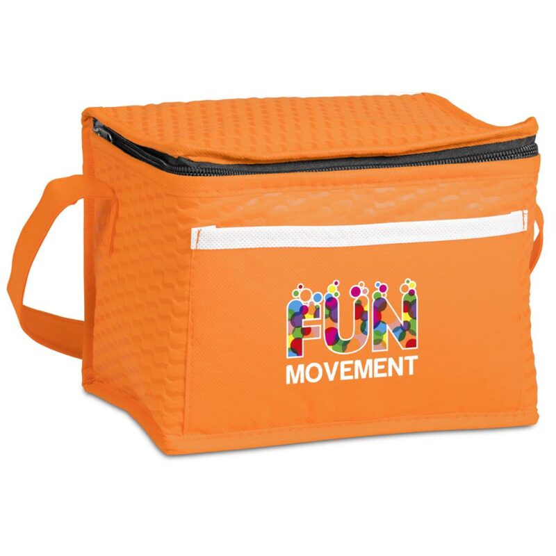 6 can printed non-woven fabric with aluminium foil lining, front pocket with contrast binding on pocket, main zip closure, and self fabric strap.